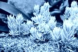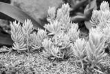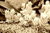 Close-up of white succulent plants Senecio haworthii growing in sandy soil, showing their velvety texture and unique form in a desert garden setting.