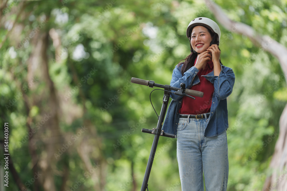 Young woman wearing helmet adjusting her headset while holding electric scooter in park