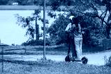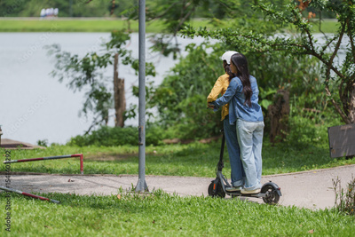 Couple riding electric scooter in park near lake, embracing sustainable transportation