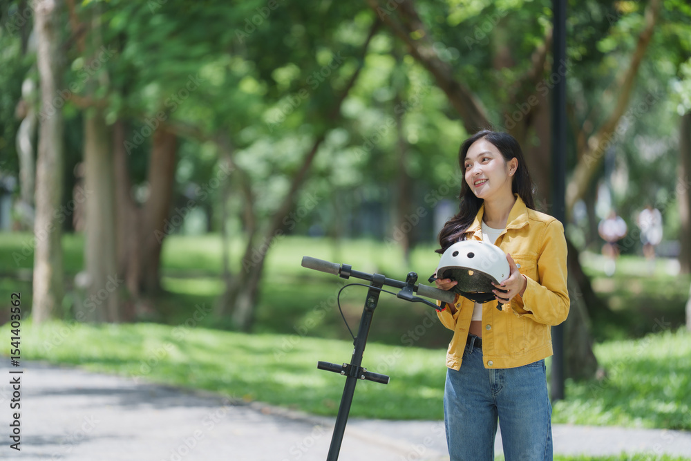 Young woman holding helmet and riding electric scooter in park