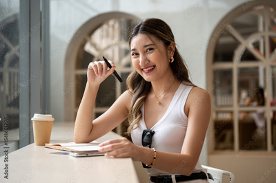 Asian woman in tank top holding pen over notebook with phone and coffee aside sits at wooden table.