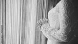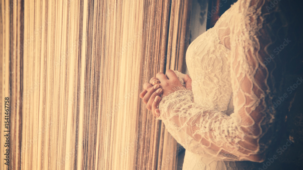 Elegant bride's hands clasped, ring on finger, wearing a lace dress. Soft focus and warm tones capture the anticipation and detail of the wedding day preparation.
