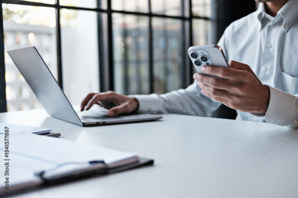Office employee holding phone and using mobile technology to manage work data on digital business platform