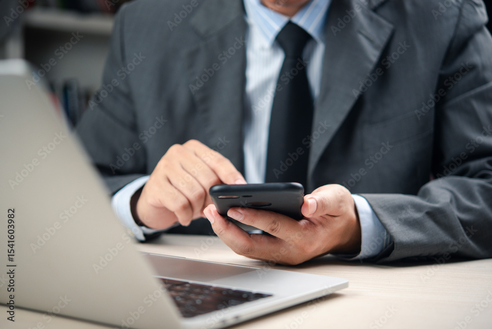 Businessman using a smartphone and laptop for remote work, digital communication, and business networking in a modern office setting.