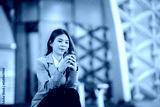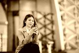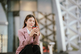 Businesswoman in pink suit holding laptop and smartphone smiling confidently outdoors in modern urban environment