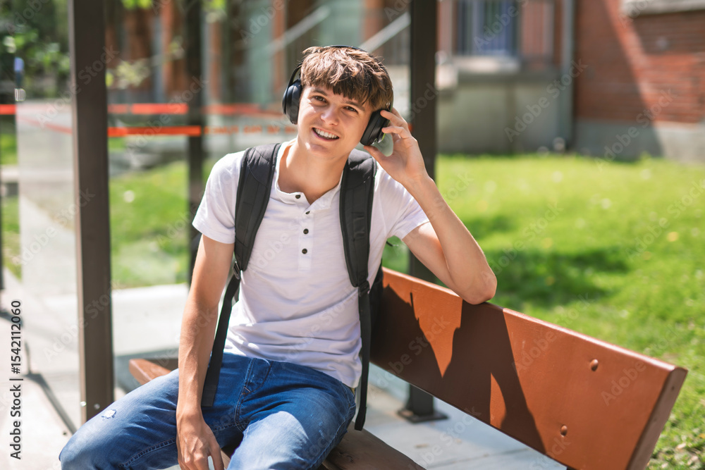 Portrait of smiling elementary school boy with his backpack waiting the bus