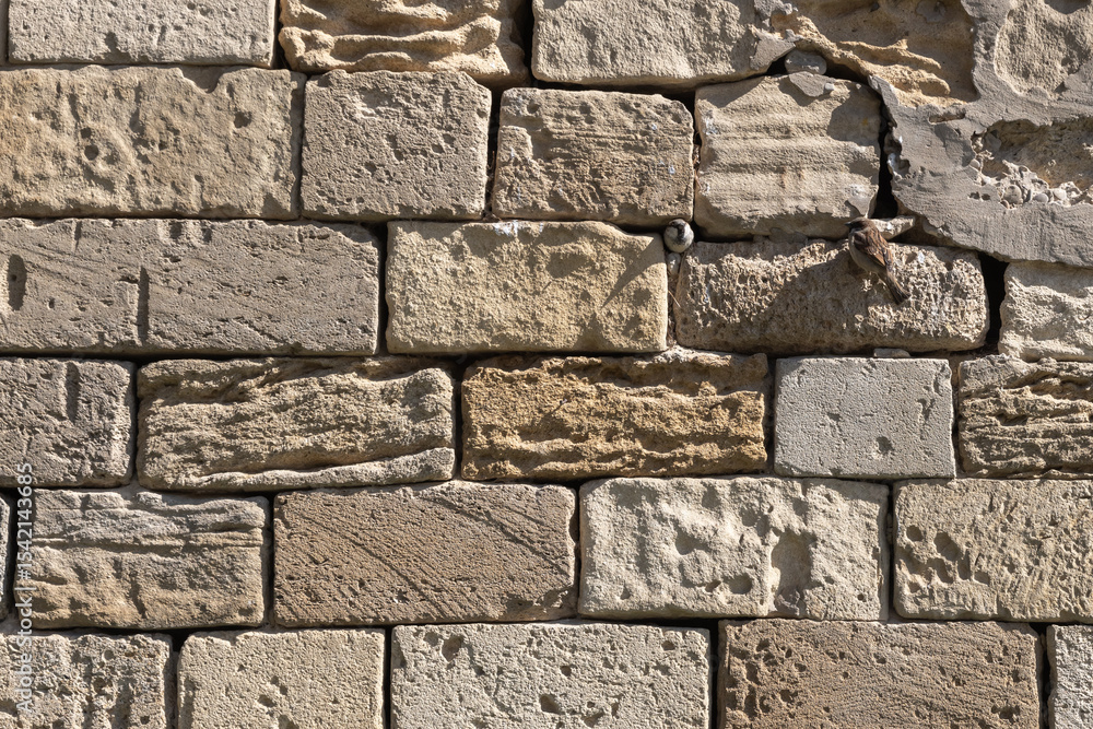 Rustic brick wall featuring weathered textures, with two small birds