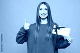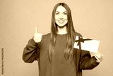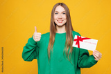 Young woman she wears green sweatshirt casual clothes hold gift certificate coupon voucher card for store show thumb up isolated on plain yellow orange background studio portrait. Lifestyle concept.