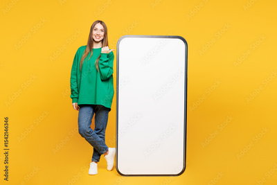 Full body young woman wear green sweatshirt casual clothes point finger on big huge blank screen mobile cell phone smartphone with area isolated on plain yellow orange background. Lifestyle concept.