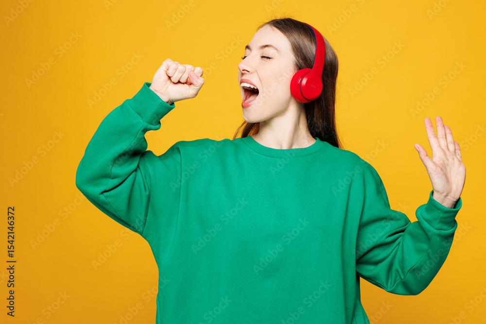 Young happy singer woman she wear green sweatshirt casual clothes listen to music in headphones sing song in microphone isolated on plain yellow orange background studio portrait. Lifestyle concept.