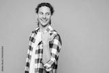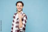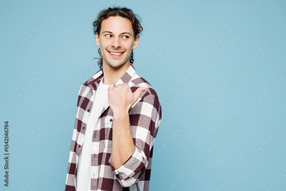 Side view young man he wear purple checkered shirt casual clothes point thumb finger aside on blank area mockup isolated on plain pastel light blue cyan background studio portrait. Lifestyle concept.