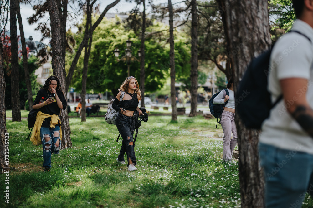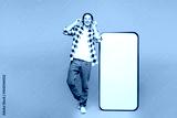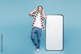 Full body young man he wear purple checkered shirt casual clothes big huge blank screen mobile cell phone smartphone with area listen to music in headphones isolated on plain pastel blue background.