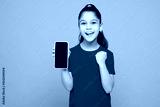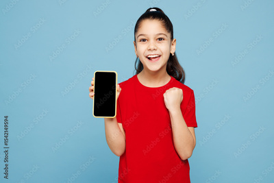 Little winner kid girl 8-9 years old wears red t-shirt hold use mobile cell phone with blank screen area isolated on blue background child studio portrait. Mother's Day love family lifestyle concept.