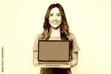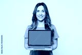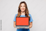 Young IT woman wears blue t-shirt casual clothes hold use work on laptop pc computer with blank screen workspace area isolated on plain solid white color background studio portrait. Lifestyle concept.