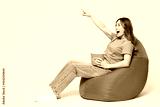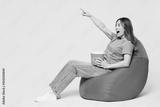 Full body young woman wearing blue t-shirt casual clothes sit in bag chair eat popcorn watch movie film point finger aside isolated on plain white color background studio portrait. Lifestyle concept.