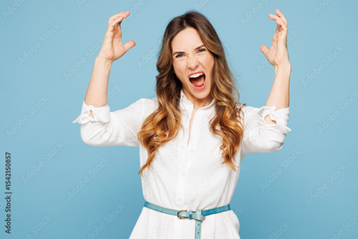Young angry mad furious employee business woman corporate lawyer in shirt classic formal clothes work in office spread hands scream shout cry isolated on pastel light blue background studio portrait