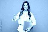 Young employee IT business woman corporate lawyer in shirt classic formal clothes work in office hold closed laptop pc computer show thumb up isolated on pastel light blue background studio portrait