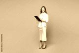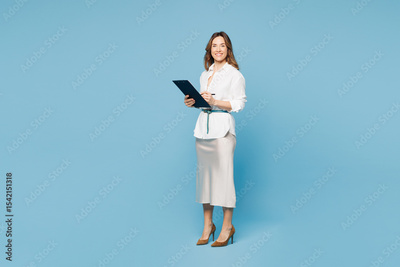Full body young employee business woman corporate lawyer wears shirt classic formal clothes work in office hold clipboard sign paper account documents isolated on plain pastel light blue background.