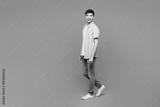 Full body side profile view smiling happy young man he wears pink shirt t-shirt casual clothes walk go look camera isolated on plain pastel light purple background studio portrait. Lifestyle concept.