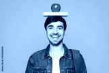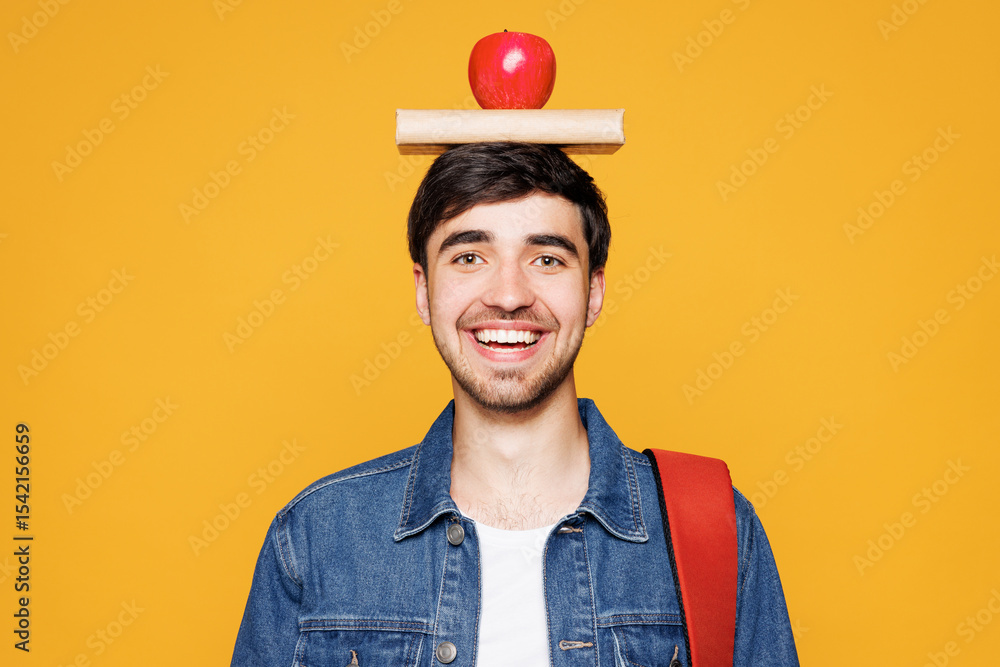Young smiling cheerful happy boy student he wear denim casual clothes backpack bag hold book on head with apple look camera isolated on plain yellow background. High school university college concept.