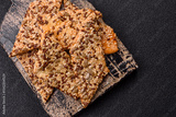 Crispbread, thin bread with seeds and grains, a baked cracker. Crispbread with sesame seeds