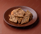 Crispbread, thin bread with seeds and grains, a baked cracker. Crispbread with sesame seeds