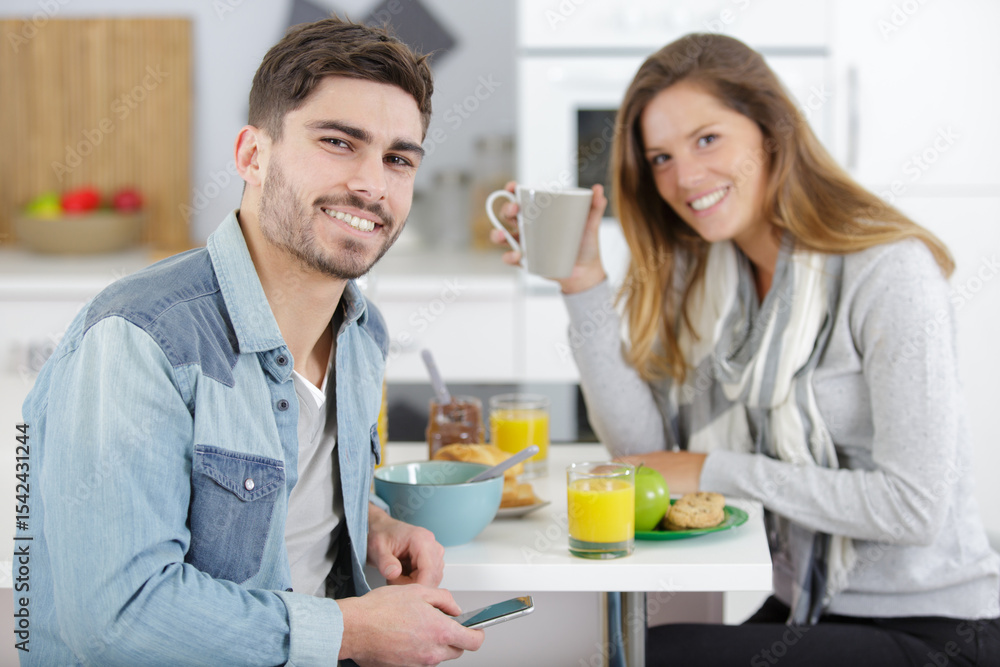 happy couple having breakfast together at home