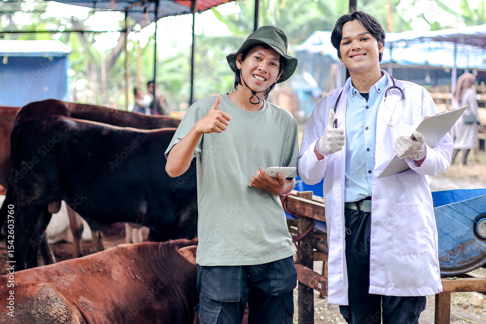 Happy Veterinarian and Farm Owner Showing Thumbs Up with Cows in Barn