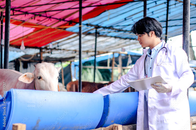 Young Man Veterinarian With Stethoscope Checking Condition of Cow With Clipboard