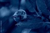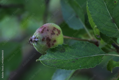 Brown spots on small green apples growing on branches in the orchard. Diseased apple tree. Malus domestica