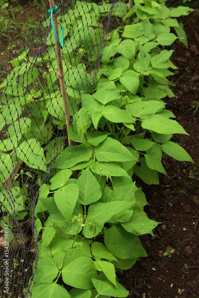 French bean plants with small white blossoms. French bean plant in bloom in the vegetable garden