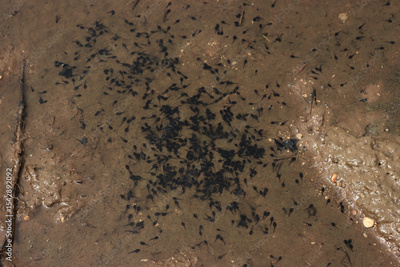 Many black tadpoles swim in a puddle in the italian countryside on early summer