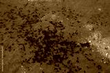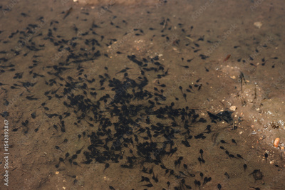 Many black tadpoles swim in a puddle in the italian countryside on early summer