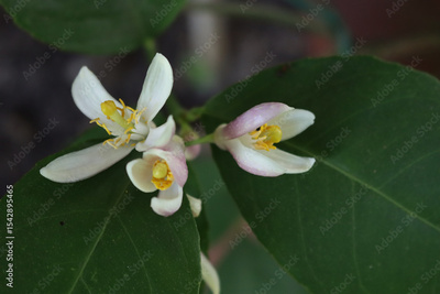 White lemon flower on plant on selective focus. Citrus limon plant in bloom