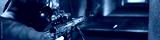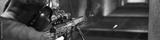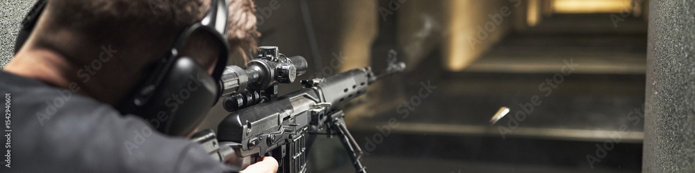 Header of man aiming rifle with scope at indoor range, wearing protective earmuffs, bullet captured mid-flight, participating in shooting club activity