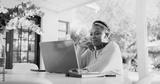 Laptop, happy and black woman with earphones for remote work, creative career and copywriting. Patio, music and person on computer for online review, writing article and digital magazine in house