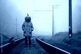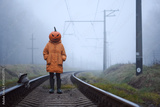 Halloween girl in pumpkin mask with scarecrow severed head poses on abandoned train tracks in thick autumn fog. Creepy railway moment with mysterious mood and fall holiday style