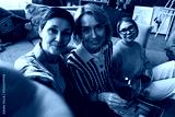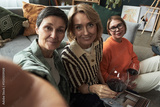 Portrait of three Caucasian adult women sitting together on sofa smiling at camera holding glasses of red wine, one woman holding magazine, showing friendship and relaxation