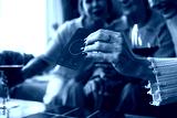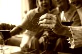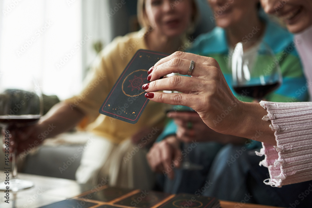 Group of young adult Caucasian women playing card game together, holding cards and drinking red wine, close up of hand with ring in foreground, friends enjoying leisure activity indoors