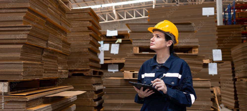 woman paper warehouse worker using tablet checking inspecting quality cardboard carton in storage. Large industry in paper product line manufacturing. Employee level wear uniform and helmet yellow.