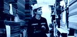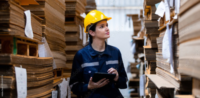 woman paper warehouse worker using tablet checking inspecting quality cardboard carton in storage. Large industry in paper product line manufacturing. Employee level wear uniform and helmet yellow.