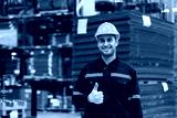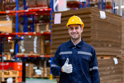 Portrait man paper warehouse worker holding thumbs up cardboard corrugated carton in storage. Large industry in paper product line manufacturing at background.