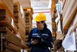 woman paper warehouse worker using tablet checking inspecting quality cardboard carton in storage. Large industry in paper product line manufacturing. Employee level wear uniform and helmet yellow.