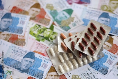 Pakistan rupees banknotes and medicine pills. The current Pakistan money bills and drugs lies on table in big amount. The concept of medicine and pharmacy in Pakistan