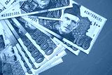 Pakistan rupees banknotes on red background. The current Pakistan money bills lies on table in big amount. The concept of business and investment in Pakistan