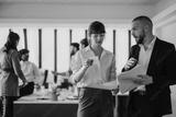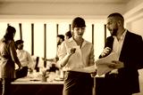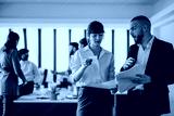 A group of business professionals collaborating in an office environment, discussing strategies and working together on project documents.