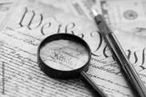 American USA Constitution paper page and magnifying glass close up
