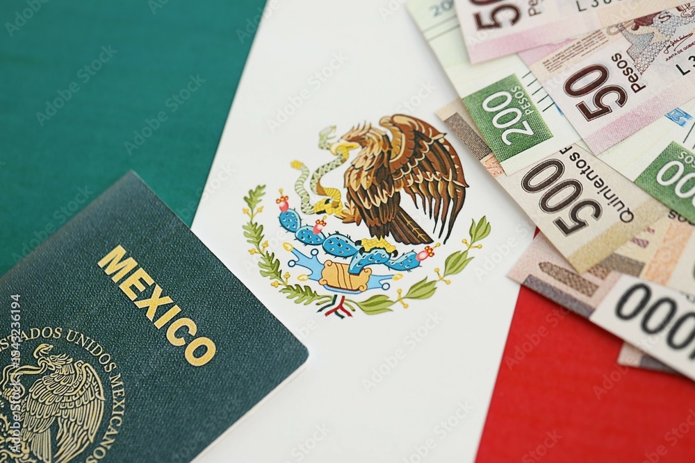 Mexican pesos money bills in big amount and passport lies on Mexico flag close up