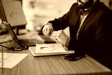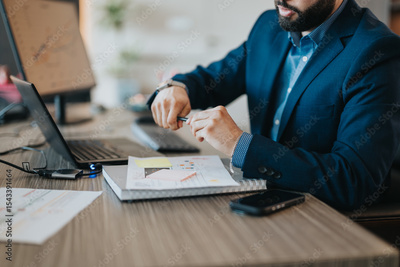 A business person in a suit reviewing charts and documents at their desk, suggesting a focused and professional work environment, productivity, and office tasks.