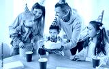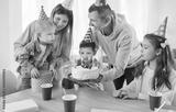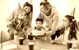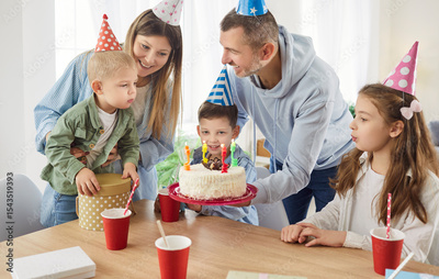 Happy Birthday to you, big family, friends overjoyed candid laughing parents, kids getting birthday surprise cake celebrating, enjoying carefree party wearing cheerful party hats, festive gathering